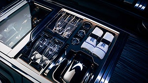 Inuti däcket finns dubbla kylskåp som kan förvara två flaskor champagne, där även fyra glas, servetter och andra tillbehör får plats. Två pallar som är designade av Rolls-Royce och tillverkades av den italienska möbeltillverkaren Promemoria matchar bilen medföljer.