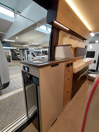 Inkommer omkring: 2026-06-22, Hjuldrift: Framhjulsdrift, Radiator grille frame & bumper painted in body color, Parking pack with 360° camera, Rear lights with partial LED technology, Fog lights with cornering light (front), LED High Performance headlights, 16" alloy wheels (silver) with summer tires, Closing aid sliding door right (electric), Habiton Red-Trim Automotive Decal, Black Leather Pure (upholstery), Trelino urine-separator toilet (alternative to Porta Potti), Outdoor shower connection & holder, Self-Sufficiency packInnehåll:Smart battery Lithium 150AhSolar system 150 WReinforced charging booster 45 A, Winter pack (Bürstner)Innehåll:Waste water tank electrically heated (heating rod)Electric drain valve for waste water tankDisposal hose (waste water hose set) in receiving pipeElectric heating rod (for diesel hot water heating), Comfort pack (chassis)Innehåll:Cup holder, frontHinged lid for storage compartments left and rightInstrument panel charging packageElectric parking brakeHigh be