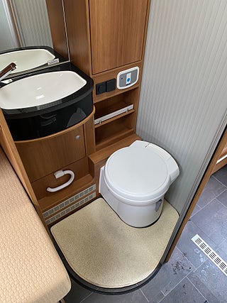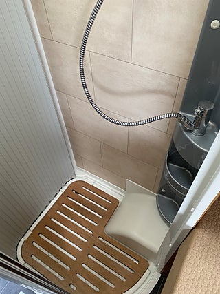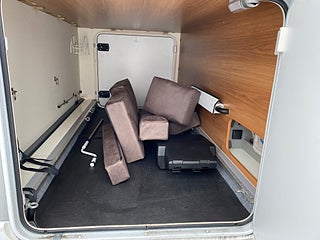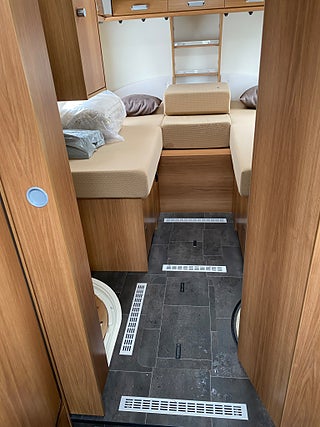 Dubbelgolv med lastutrymme och där även gråvattentank ligger isolerad.