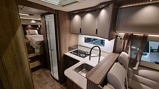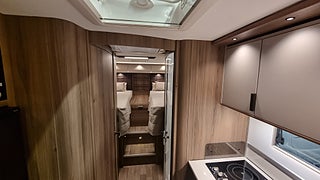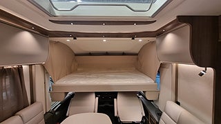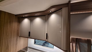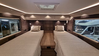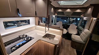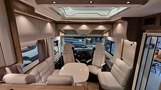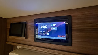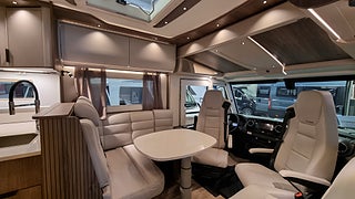 Husbilen har KABEs största energipaket med 300 Ah litium solcell och kraftfull inverter som ger 230V vid fricamping. All teknik styrs via Kabe Smart D 2.0 där du hanterar bland annat taksäng vattennivåer och belysning via touchpanel.