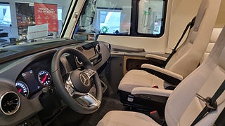 Mercedes säkerhetssystem ger adaptiv farthållare autobroms körfältscentrering och trötthetsvarnare. Husbilen har hydrauliska stödben inbrottslarm centrallås på alla luckor Imperial Sound System router MBUX med backkamera och trådlös laddning.