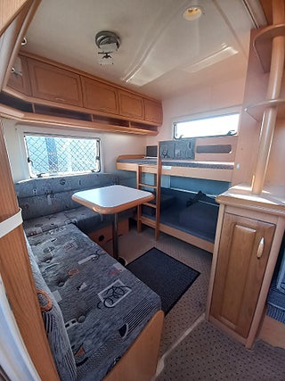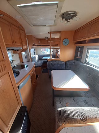 stor nerbäddningsbar u-grupp på mitten, 2våningssängar samt nerbäddningsbar liten soffgrupp bak, mörkläggningsgardiner i alla fönster, stor förvaring under dubbelsängen som går att komma åt även utifrån, stort isabella förtält ca 4år gammalt