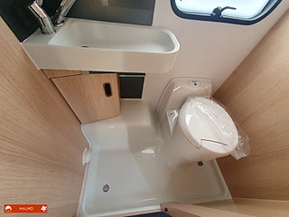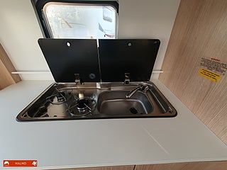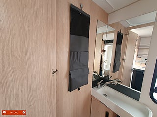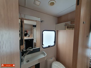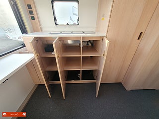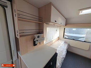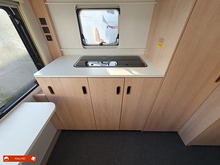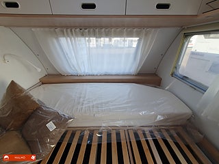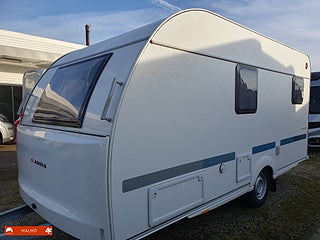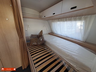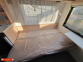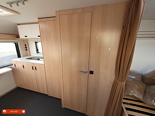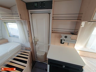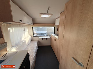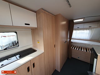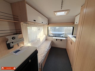 Perfekt smidig resevagn med tre bäddar, Kök utr med häll diskho samt kyl med frysfack, Bra förvaring med bla stor garderob, Sovrum med mysig dubbelsäng fram med förvaring under och skåp ovanför, Badrum med toa och handfat