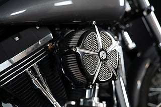 En riktigt cool Street Bob Dyna har kommit in hos oss på Bikeman! Den är utrustad med ett 10" Craftride styre. Den har Vance & Hines Short Shots Staggered avgasrör som mullrar ordentligt! En luftburk Venturi i Roland Sands Design - RSD. Och även en pakethållare för att få med extra packning på ditt nästa äventyr!