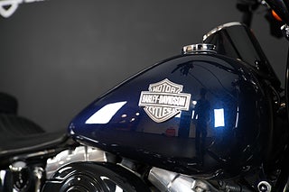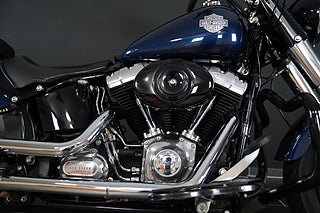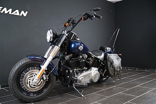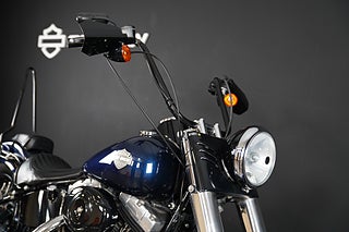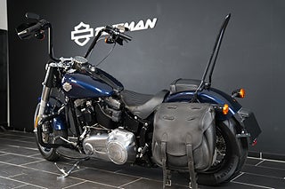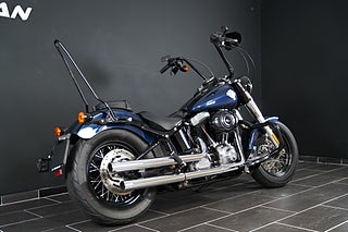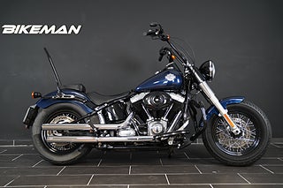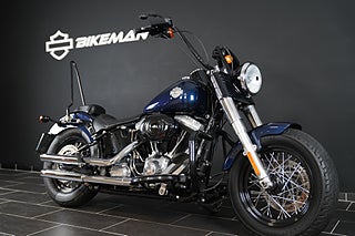 En Softail Slim har just rullat in i hallen! Lackad i Big Blue Pearl. Utrustad med Vance & Hines slip-on som mullrar fint! 16" Aphäng-styre som ger en bekväm körställning. Lejonkulan sidoväska i läder. Handguards - Handskydd för att slippa stänk och vind på händerna. Motorbåge. Sissybar - Ryggstöd för passagerare.