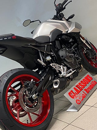 – Den futuristiska och avskalade designen går igen över hela hojen, från den spetsiga strålkastarkåpan och de lika spetsiga, framåtsträvande kylarkåporna till den minimala bakändan och den korta ljuddämparen. Det är ett slimmat, sportigt och aggressivt intryck man får av GSX-8S.