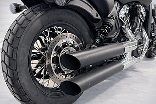 Utrustad med Vance & Hines avgassystem som ger ett kraftfullt och snyggt ljud. Mini ape-hanger styre för rätt attityd och körställning. Ekerfälgar och Pirelli MT60RS däck som förstärker bobber-looken. Solo-sadel i premium utförande.