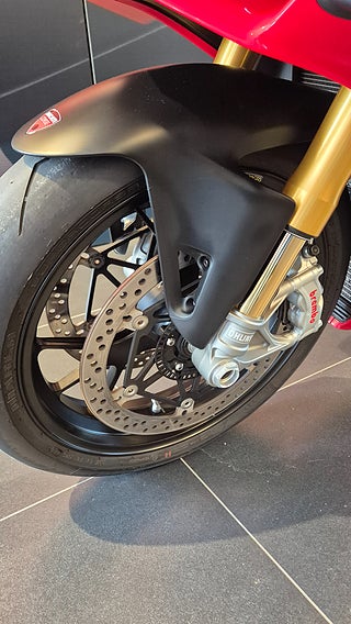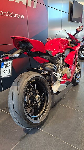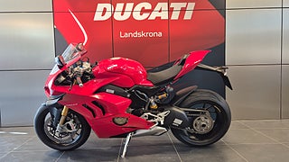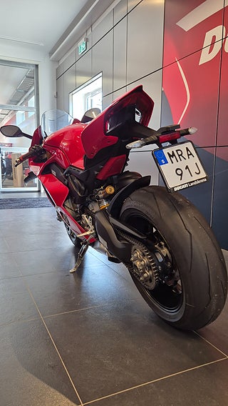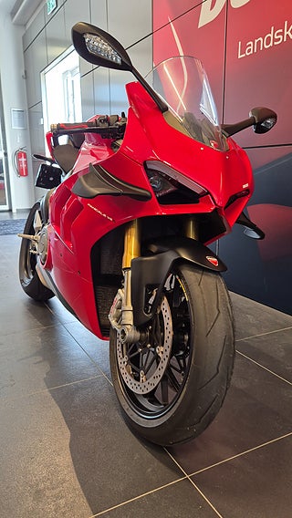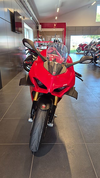 V4 desmodromisk motor på 1103 cc och 214 hk. Motroterande vevaxel. Ducati Quick Shift. Riding Modes. Power Modes. Bosch Cornering ABS EVO. Ducati Traction Control. Ducati Wheelie Control. Ducati Slide Control. Engine Brake Control. Auto tyre calibration. Electronic Suspension med Öhlins fjädring och styrdämpare. Lithium-ion batteri. Smidda Marchesini aluminium fälgar m.m. 2.400 mils service intervall. 214 hk@13.000 v/min. 124 Nm@10.000 v/min. 174 kg (torrvikt • Ducati Red with grey frame and black wheels •Latest-generation electronic package with 6-axis Inertial Measurement Unit (6D IMU): ABS Cornering Bosch EVO; Ducati Traction Control EVO (DTC EVO). Ducati Slide Control (DSC). Ducati Wheelie Control EVO (DWC EVO). Ducati Power Launch (DPL). Ducati Quick Shift up/down EVO (DQS EVO). Engine Brake Control EVO (EBC EVO) •Riding Modes (Race. Sport. Street) •5" full-TFT dashboard •Braking system with new Brembo Stylema® monobloc calipers •New Pirelli Diablo Supercorsa SP tyres. 200/60 at the rear