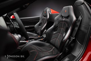 Rosso Corsa med Nero läderinteriör inkl Rosso stitcing samt kolfiberskalstolar.