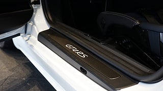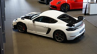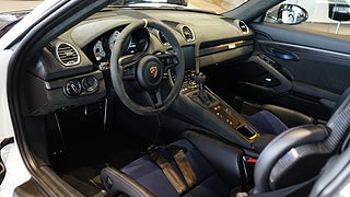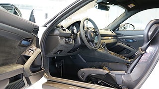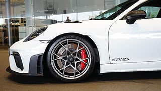 Carrara white metallic med Läderinteriör Weissach Black/Deep Sea Blue med utökat läder och Race-Tex, 20 tum 718 Cayman GT4 RS i Satin Darksilver inkl. navkåpor med RS-logo.