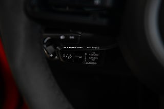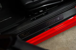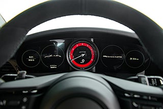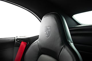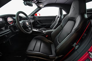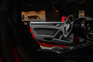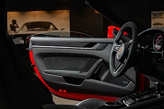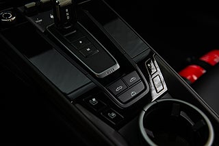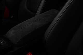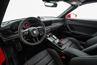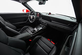 Öppna förardörren och du möts av en färgpalett som kompletterar utsidan perfekt. Svart läder och alcantara löper över hela insidan och möter kontraster i både varvräknare och bälten som precis som exteriören går i Guards Red. Sportstolar med både värme och ventilation är ett av våra absoluta favorit tillval på en modern cab. Ventilation en varm sommardag och värme som förlänger cab-säsongen tillsammans med den eluppvärmda ratten. Högtalarsystem från BOSE såklart men även lite mer ovanliga tillbehör. Så som Porsche intelligenta förarassistent InnoDrive.