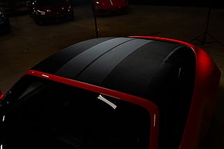 Det som möter dig först när man närmar sig denna klarröda GTS är onekligen den dekorativa stripen som löper över vad som först bara verkar vara huven. Stripen möter bilens färgpalett perfekt i svart och binder fint ihop helheten tillsammans med de svarta fälgarna och taket. Några steg ytterligare är det just taket som man noterar. de som började som svarta stripes över fronten övergår i grått över den svarta suffletten. En rent ut sagt asläcker detalj som verkligen förändrar helheten. Längs sidan av bilen återfinns ett litet svart 'GTS-emblem' bakom framhjulet och bakpartiet domineras av en ljusramp i Exclusive Design. Det är verkligen en exteriör som i sin helhet står ut från mängden och det är tydligt att man har tagit sig tid att specificera bilen.