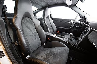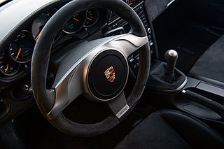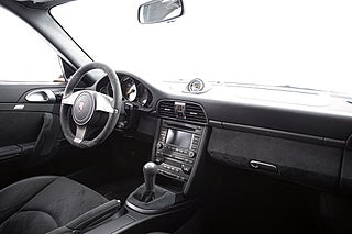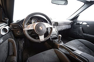 Framför oss har vi en 997.2 GT3 av årsmodell 2010 iförd en tidlös elegant kostym tack vare sin Arctic Silver exteriör med fälgar lackerad i titan grå metallic. Men precis som en bodybuilder i kostym så är det svårt för GT3 att dölja musklerna även i en elegant färg. Den aggressiva fronten som tydligt är formad efter funktion kompletteras av den dominanta vingen bak. Det finns inga oklarheter om vad bilen är konstruerad för. Öppna förardörren och du möts av en förarmiljö som precis som exteriören inte ger plats för frågetecken. Alcantara och läder klär insidan med viktiga kontaktpunkter så som växelväljare och ratt klätt i alcantara. Bakom sportstolarna som alltid i GT3 så hittar du inget mer än ett emblem där baksätet engång huserade. Och även om grunden är en 997 så är känslan av en GT3 något helt annorlunda.
