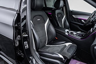 Exteriört är bilen utrustad med AMG Night Package, som förstärker bilens redan aggressiva linjer med svarta designelement. AMG-frontspoiler, sidokjolar, skärmbreddare och en kolfiber vinge bak ger ett distinkt utseende, samtidigt som rödlackerade bromsok och spoilerkant sätter pricken över i. LED-strålkastare med automatisk helljusreglering och hjälpbelysning ger både stil och funktion i alla lägen.