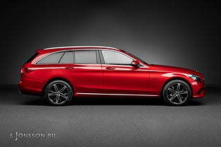 Mercedes-Benz C 300 de laddhybrid i facelift utförande. Lackerad i Manufaktur kulören Hyacint röd metallic som möts med en svart interiör.