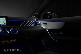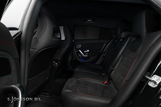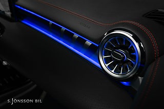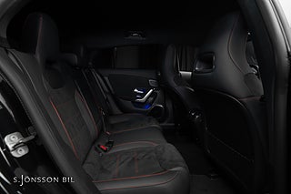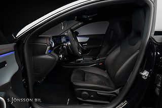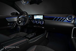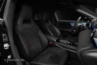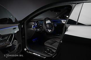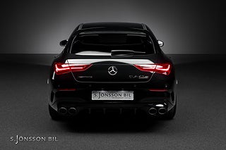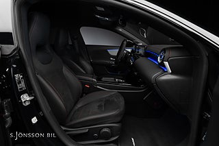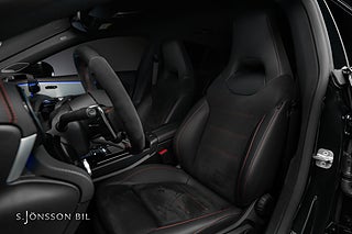 Mercedes-AMG CLA 45 S 4MATIC+, lackerad i färgen Cosmos svart metallic och inredning i svart läder med röda kontrastsömmar.