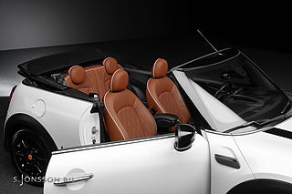 Mini Cooper Cabriolet lackerad i kulören Nanuq vit med läderklädsel i Chester/malt brun.