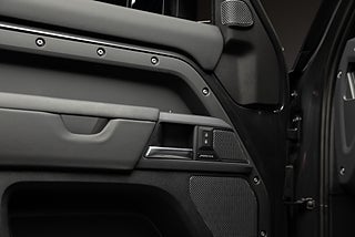 Land Rover Defender 110 P400e laddhybrid, folierad i matt Carpathian Grey från fabrik kombinerat med svart läderinteriör. Under folieringen är bilen Carpathian Grey metallic.