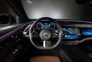 Leasbar E 300 e laddhybrid. Extrautrustad för 199.000 kr, bland annat med Superscreen och Burmester 4D surround sound system med 17 st högtalare och 730 watts förstärkareffekt.