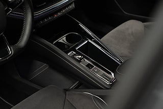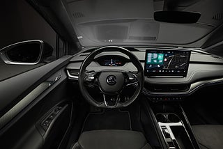 Skoda Enyaq iV 80 Sportline lackerad i Graphite Grey Metallic med sportstolar i alcantara/läderklädsel.