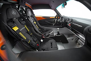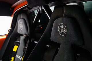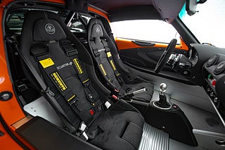 Insidan är som sagt rätt så fri från bekvämligheter. Skalstolar i kolfiber med 6-punktsbälten fästa i halvburen baktill. Framför föraren en avskalad förarmiljö med en alcantara ratt med 'snap-off' fäste. Till vänster om ratten finns Lotus DPM reglage som låter föraren välja körläge och även lätta bilens säkerhetssystem.