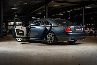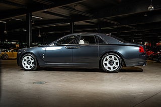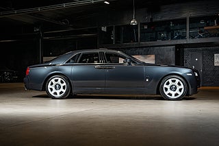 Det råder ingen tvivel om vad du närmar dig när man går fram till denna Serie I Ghost. Den vertikala grillen som dominerar fronten är ikonisk och så märkes specifik att även om du är helt okunnig inom motorvärlden så vet du att detta är en Rolls-Royce. Ovan pryds noskonen av 'The Spirit of Ecstacy'. Märkets ikoniska emblem som stolt alltid har suttit längs fram på bilarna. Sportighet är inte något som har varit en fokus punkt när man har formgivit Ghost. Det är istället en ganska kantig och sober formgivning som här är klädd i en metallic grå kostym som får eleganta kontraster i sina borstade och polerade detaljer i aluminium. Bilens sidoprofil genomskärs av en så kallad 'coach-line' som hand ritats in över bilens skulderlinje. I övrigt hålls bilen avskalad och fri från onödiga detaljer.