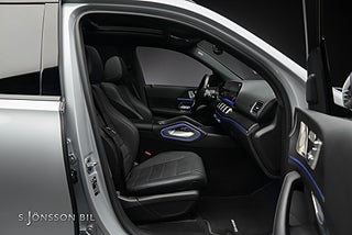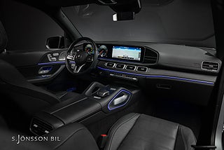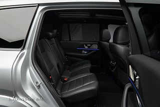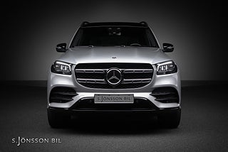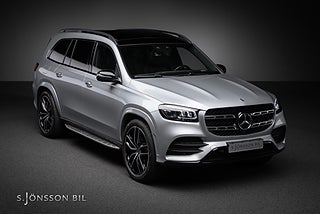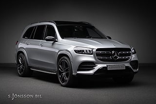 7-sitsig Mercedes-Benz GLS 400d AMG, lackerad i High-Tech Silver metallic med interiör i svart läder.