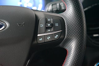 Utrustad med ST-Line sportpaket, digital display, navigator, backkamera, Apple CarPlay, adaptiv farthållare, parkeringshjälp, lane assist, döda vinkelvarnare (BLIS), eluppvärmd framruta, infällbara speglar, automatisk bagagelucka samt delskinn/alcantara-stolar.