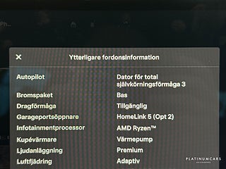 Utrustning: Autopilot paket, Adaptiv luftfjädring, Värmepump, Panoramaglastak, Dragförmåga - tillgänglig, YOKE ratt, Rattvärme, 17” touchskärm, Navigation, Tv/-touchskärm bak, Premium högtalarsystem, Bluetooth, USB/Ipod-anslutningar, Sätesvärme fram & bak, Ventilation i stolar fram, Kolfiber dekorinlägg, Takhimmel i alcantara, Automatlåda för eldrift, Fyrhjulsdrift, Körlägesväljare för bästa körupplevelse, Adaptiv farthållare, Signal för dödavinkelvarning, Främre kollisionsvarning, Styrassistans vid kollisionsfara, Automatisk nödbroms, Backkamera inkl sidokameror, HomeLink 5, Kolfiber spoiler bak, Svarta lister runt fönster, 21” svarta lättmetallfälgar, ABS, Antispinn/Antisladd, Larm, mm.