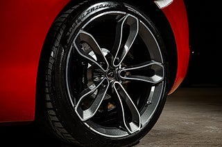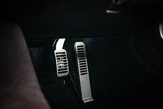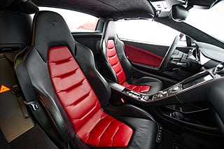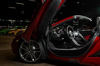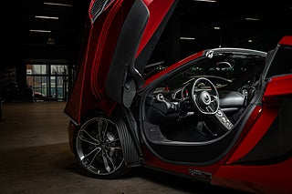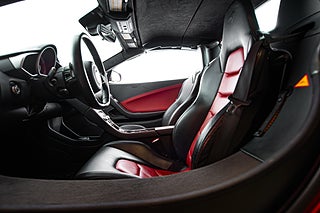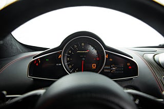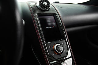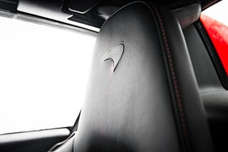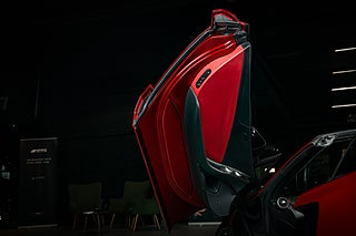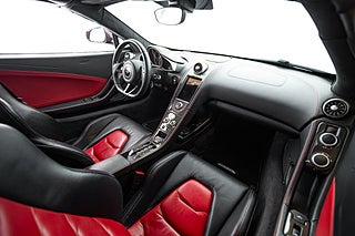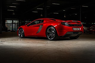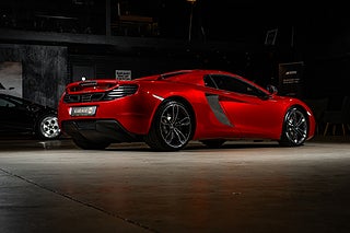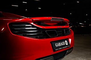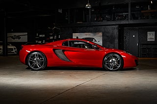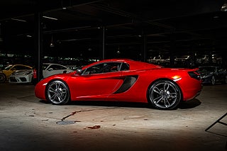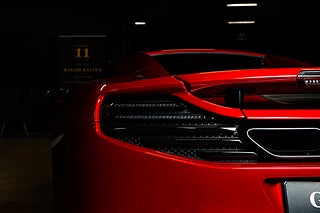 Och visst är det något speciellt. Tillverkad i det närmaste uteslutande i kolfiber med en guten kolfiber-monocuque och driven av en dubbelturbo-matad V8 på 3.8L. Initialt hade bilarna dryga 600hk men i ett tidigt skred så uppdaterades dom till 625 som är fallet för denna bil från 2013. En banbrytande konstruktion och motorkonfiguration i segmentet i tid. Exteriören är dramatisk och slående i sin design. Det råder ingen tvivel om att man närmar sig något extremt när man kommer fram till denna pärlemor röda MP4-12C en kulör som McLaren själva benämner Vulcano Red. Den dramatiska exteriören lyckas trots sitt extrema utseende med att vara ganska avskalad och återhållsam med detaljer. Dörrhandtag är gömt under bält-linjen och sido-profilen domineras av insugen i kolfiber bakom dörren. Baktill så kan bilen vid första anblick tyckas sakna baklampor men dessa är gömda i grillgallret tillsammans med avgassystemet. Exteriören är välbevarad men lacken påvisar visa brister i form av kärleksmärken från polering.