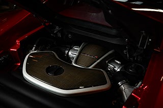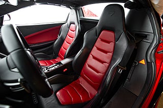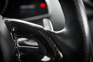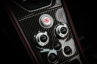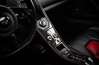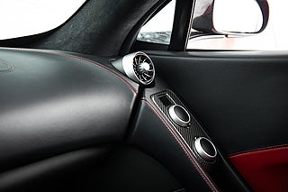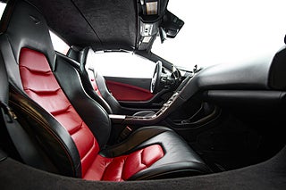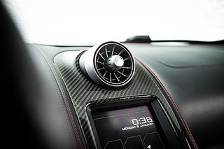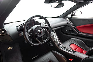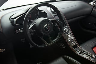 De gömda dörrhandtaget poppar dörren som i sedvanlig ordning för en super bil går uppåt och öppnar för en helt unik interiör med en tydlig delning mellan förare och passagerare. Mittkonsolen huserar infotainment system parat med ljud från Meridian och ramas in i kolfiber. Längre ner sköts bils dynamiska inställningar med två justeringsvred som styra chassi och drivlina. Förarmiljön är påtagligt avskalad och dräpt precis som resten av interiören i läder och kolfiber. I mitten så huserar en stor tydlig och analog varvräknare som flankeras på båda sidor av funktionsdisplayer.