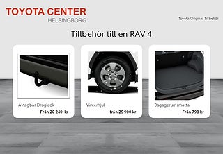 Toyota RAV4 Plug-in Hybrid erbjuder en kombination av prestanda och effektivitet. Med upp till 75 km elektrisk räckvidd (WLTP) och fyrhjulsdrift är den redo för både vardagskörning och äventyr. Dessutom har den ett rymligt bagageutrymme och avancerade säkerhetsfunktioner, vilket gör den till ett attraktivt val för familjer och aktiva individer., Baksätets ryggstöd justerbart i lutning,Förarsäte med elektriskt justerbart ryggstöd,Smartphone Integration (Apple CarPlay and Android Auto),Backkameradisplay integrerad i audioskärmen,Passagerarsäte fram manuellt skjutbart,Backspegel inre automatiskt avbländande,Dörrlås automatiskt styrt av bilens hastighet,Fönsterhissar elmanövrerade med klämskydd,Multiinformationsdisplay med 7-tums skärm,Ratt med styrningskontroll för körfilsvarning (LDA),Körfilsassistans (LDA with steering control