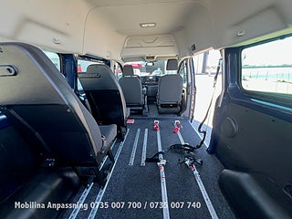 Komplett utrustad för färd med passagerare i rullstol med 3-punktsbälte för rullstolspassagerare samt 4 förankringar för rullstol.
