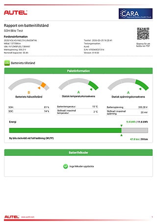 Airbag passagerare (avstängningsbar), Nästa service om 287 dagar eller 2710 mil, Bilen är batteritestad där SOH (State of Health) visar 81%.