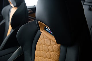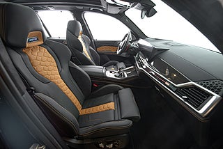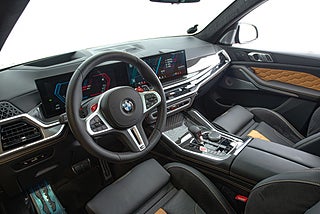 Insidan är nästan lika svart som exteriören. Det svarta lädret bryts av med inslag i naturbrunt och är vackert insytt med ett hexagon-mönster över stolarna som även är försedda med ett upplyst X5 emblem. En liten men trevlig detalj. Dekorlist i kolfiber möter detaljer i borstad aluminium och kantas lite här och var av sömmar i samma naturbruna färg som delar av lädret. Framför föraren en typisk M ratt som erbjuder snabbval för olika köplägen tillsammans med en rad andra funktioner och strax där bakom två stora displayer som står för både fordons funktioner såväl som infotainment,här sammankopplat med ljud från Bowers&Wilkins. Ovan ett stort panoramatak som BMW själva benämner SkyLounge som erbjuder mer än bara bättre ljusinsläpp. Här finns nämligen även möjlighet att ljusätta.