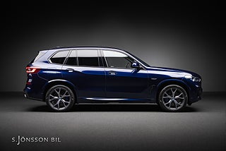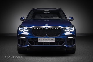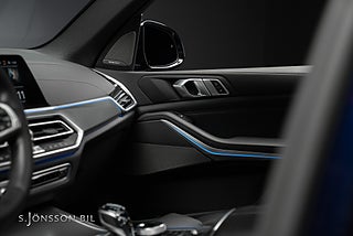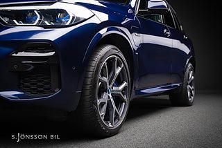 BMW X5 45e M-Sport laddhybrid, lackerad i Tanzanitblå metallic kombinerat med interiör i svart läder.