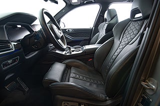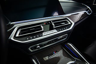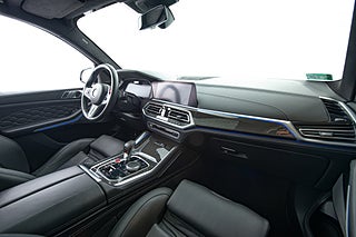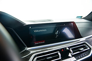 Insidan går helt i svart. Det svarta lädret är elegant insytt med diamant mönster över stolarna som även är försedda med ett upplyst X5 emblem. En liten men trevlig detalj. Dekorlist i kolfiber möter detaljer i borstad aluminium och kantas lite här och var av sömmar i BMWs M färger. Framför föraren en typisk M ratt som erbjuder snabbval för olika körlägen tillsammans med en rad andra funktioner och strax där bakom två stora displayer som står för både fordons funktioner såväl som infotainment,här sammankopplat med ljud från Harman/Kardon.