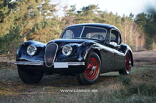 Jaguar XK120 Coupe från 1952 är en vacker klassiker med en 3, 4-liters rak sexcylindrig motor som levererar 162 hk. Denna matchande nummersbil, importerad från USA till Sverige 2012, har använts sparsamt och stått på museum. Exteriören i svart med röda ekrade hjul ger ett sportigt intryck, och bilen är i mycket gott skick, både ovanpå och under. Inredningen, med läderklädda säten och träpaneler, är också i utmärkt skick. Den har nyligen genomgått service, fått nya bränsleledningar och ett rostfritt avgasrör, och är nu redo för att köras.