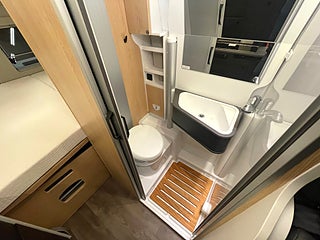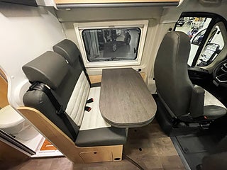 Planlösning: Tvärställd dubbelsäng bak + sovloft i pop-up taket. Rymligt kök och badrum med duschmöjlighet.