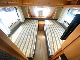 Med sin bredd på 230 cm är det här en vagn som är smidig på vägen. TV/barskåp kan vändas mot sovrum eller köksdel, se bilder. Bra bäddmadrasser ger fin sovkomfort, skjutdörrar till sovrummet är ett extra plus.