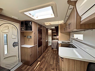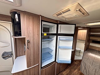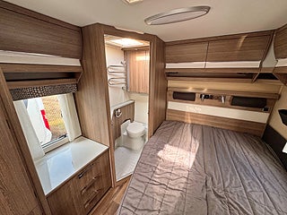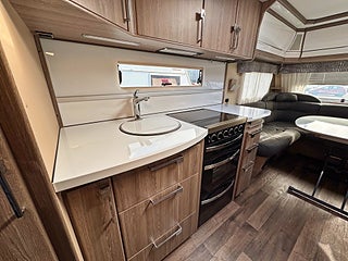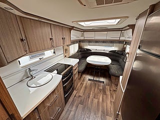 Välutrustad och rymlig husvagn med totalvikt på 2000kg. 4-lågigt gasolkök och ugn med dubbla fack, rymlig arbetsbänk. Bäddbar sittgrupp framtill och bred franskbädd baktill, generöst badrum.