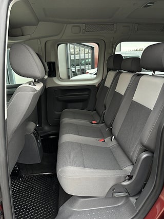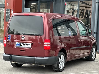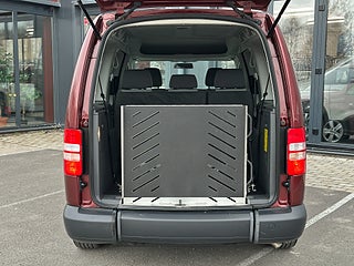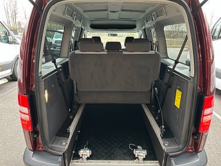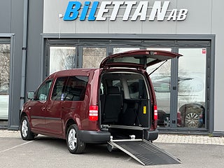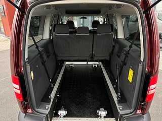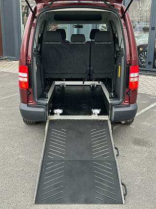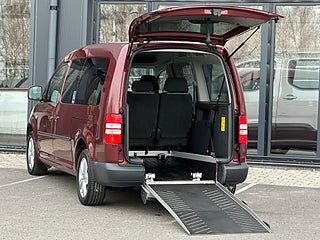 Volkswagen Caddy Maxi Life Kombi 1.6 TDI Handikappanpassad med 2 delad manuell ramp baktill. Plats för passagerare i rullstol bak. Godkänd för person att sitta kvar i sin rullstol under färd. 2 elektriska rullstols fästen fram samt 2 manuella och avtagbara fästen bak. 3 punkt bälte för person i rullstol. 6 personer ink 1 i rullstol kan färdas i bilen.