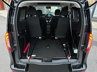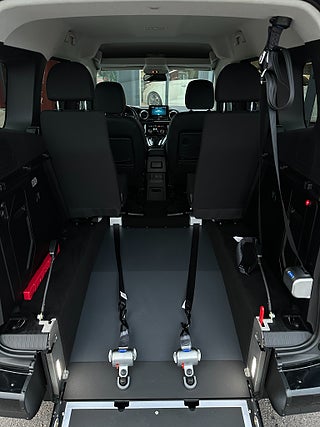 Mercedes-Benz T 180 DCT Euro 6 Handikappanpassad golvsänkt baktill med manuell ramp som även kan fällas in för att få normalt bagage utrymme, Person kan sitta kvar i sin rullstol under färden. 3 punkt bälte för person i rullstol samt 4x förankringar för rullstol. Mått invändigt rullstolplats: Höjd: 144cm / Bredd: 80cm / Längd: 150cm.