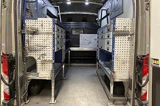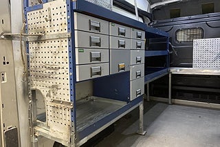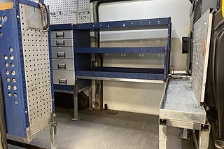 Perfekt utrustad för att vara rullande verkstad. Bara att flytta in. Lättåtkomliga hyllor då bilen även har sidodörr på vänster sida och ståhöjd i lastrummet.