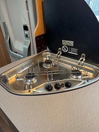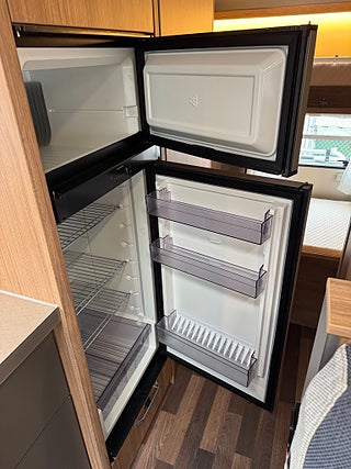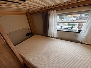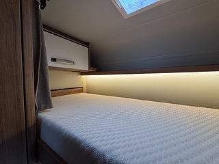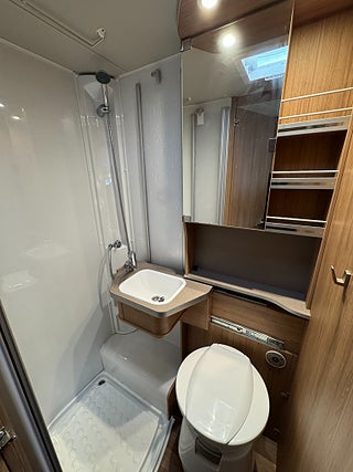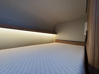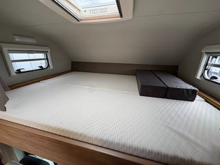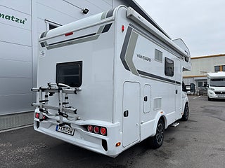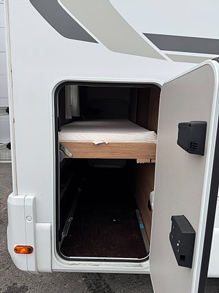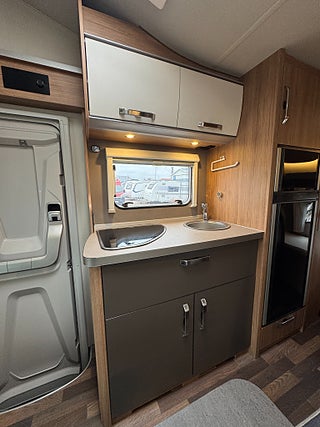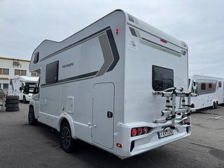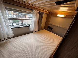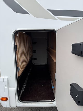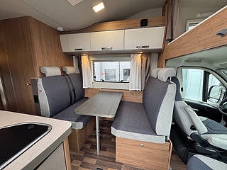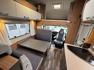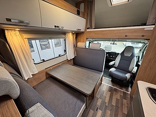 Inredningen andas modern tysk design med de mörkare träslaget på golv och väggar tillsammans med de vita skåpsluckorna och den gråa klädseln . I fram finns loungen med två soffor så får man gott om plats kring matbordet man kan även svänga pilotstolarna i fram för att få fler sittplatser om så önskas. Köket är rymligt trots bilens nätta längd, det finns en tre-lågig spis och en uppfällbar bänkskiva för extra avlastning. I bak finns sovrummet med en rymlig våningssäng och tack vare att den är placerad bak i bilen får man ett trevligt och avskilt sovrum. I fram finner man den rymliga alkovsängen och soffgruppen går att bädda om till en dubbelsäng om så önskas.