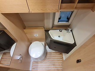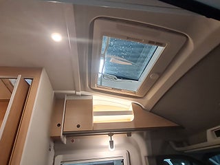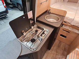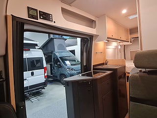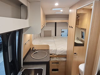 Praktisk sittbänk och bord med extra skiva. Jättesmart badrum med delad dörr för bästa utnyttjande av utrymmet. Kök med extra arbetsyta och kompressorkyl. Dubbelsängen bak är bredare nu, tack vare extrautrymme i karossens sidor.
