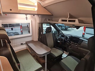 Planlösning: Smidig och flexibel planlösning med vändbara stolar och halvdinette. Ford karossen är luftig och hög, med bra takhöjd och smart förvaring ovanför hytten.