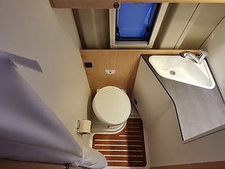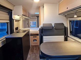 Planlösning: Smidig och flexibel planlösning med vändbara stolar och halvdinette. Bra badrum med dusch möjlighet - med riktig dörr. Kylskåp i kökets högkant. Liten garderob bredvid badrummet. Bra lastutrymme under sängen bak med åtkomst in och utifrån. Dubbelbädd som kan smidigt staplas på en sida. Dörr bak för smidig lastning