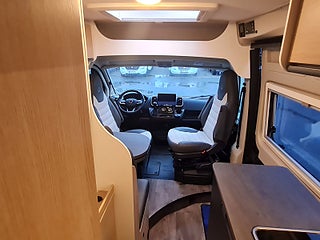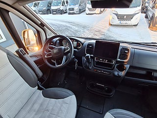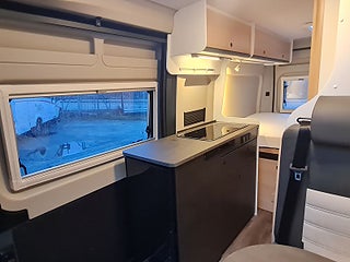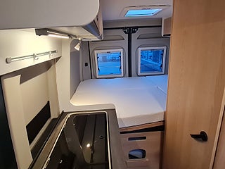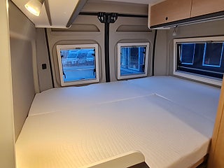 Tekniska data: Årsmodell 2025, mätarställning 1800 mil, Fiat Ducato chassis, turbo diesel på 140 hk, automat. Längd 599 cm, totalvikt 3500 kg (B-kort), lastvikt 600 kg, 4 bältesplatser, 3 sovplatser (2 dubbelsäng bak + möjlighet att bädda i dinetten). Reg nr WAZ86L, skatt 8895 kr.