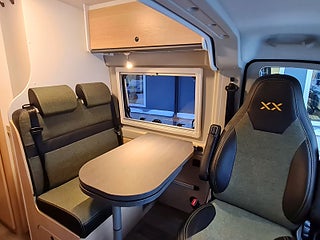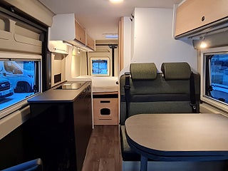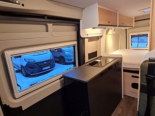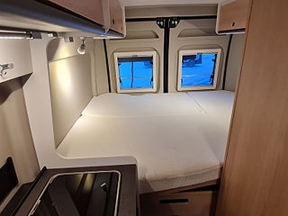 Planlösning: Smidig och flexibel planlösning med vändbara stolar och halvdinette. Smart badrum med fönster för utedusch. Kylskåp i kökets högkant. Bra lastutrymme under sängen bak med åtkomst in och utifrån. Dubbelbädd som kan smidigt staplas på en sida. Dörr bak för smidig lastning